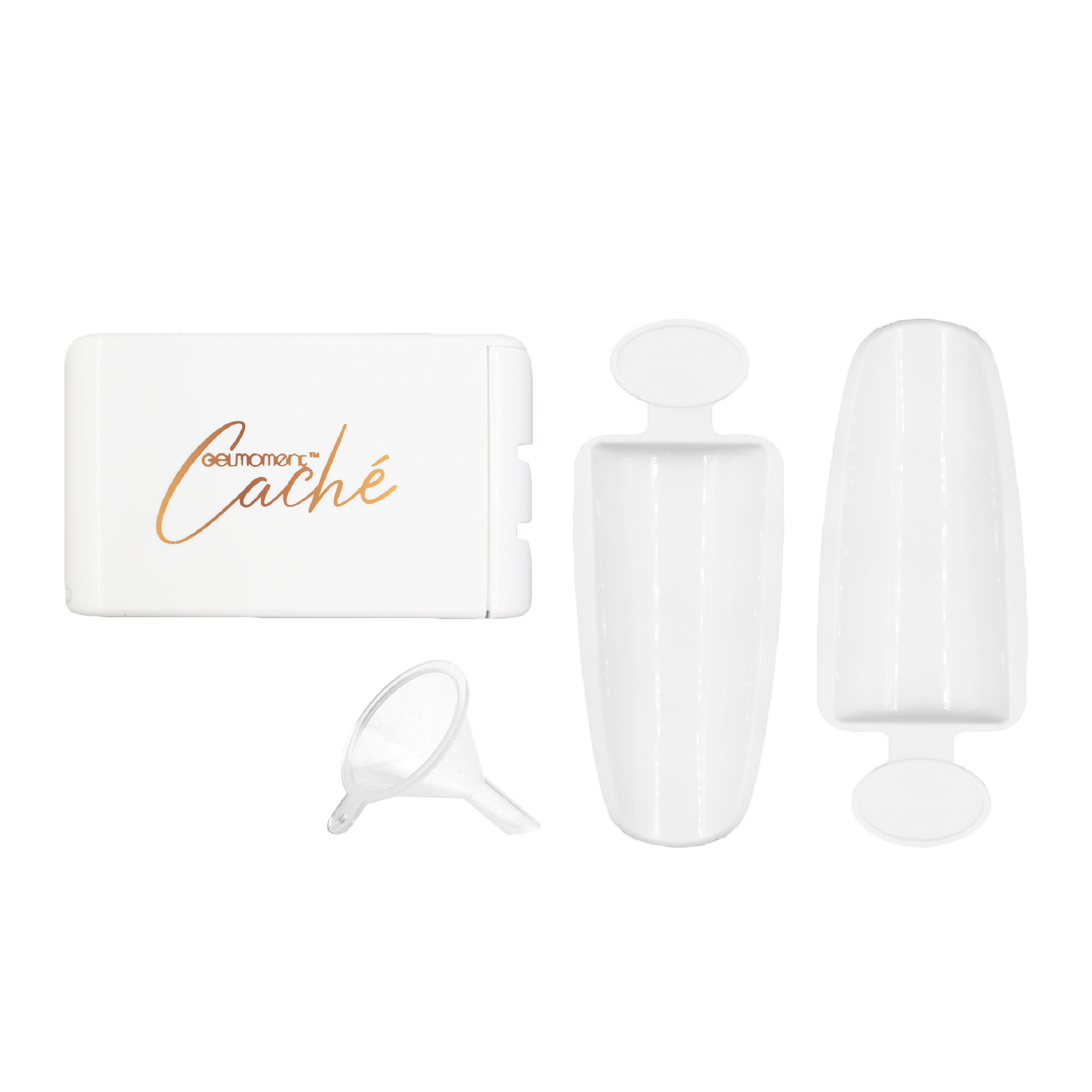 Gelmoment caché, a convenient recycling system that reduces product waste when creating beautiful nail art. Caché increases the ease of cleaning up with its two-tray design that collects and reuses excess powders and glitter effectively.